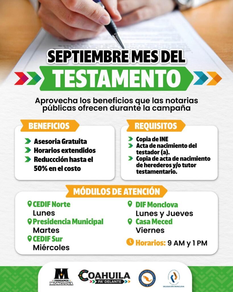 Monclova, Coahuila, 22 de septiembre de 2025.- El Gobierno Municipal que encabeza el alcalde Carlos Villarreal invita a la ciudadanía a aprovechar durante septiembre el programa del Mes del Testamento, que ofrece un descuento del 50 por ciento en el trámite, además de asesoría jurídica gratuita, en coordinación con el Colegio de Notarios de Monclova, que encabeza la Lic. Hilda Ríos. El objetivo es dar certeza jurídica a las familias de Monclova mediante un proceso accesible y confiable.