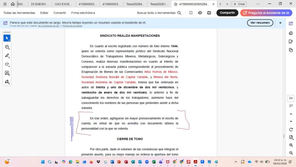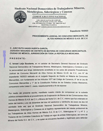El sindicato había solicitado comparecer en la subasta pública correspondiente a la enajenación de bienes de AHMSA y Minera del Norte, argumentando interés en salvaguardar los derechos de los trabajadores dentro del procedimiento de quiebra.