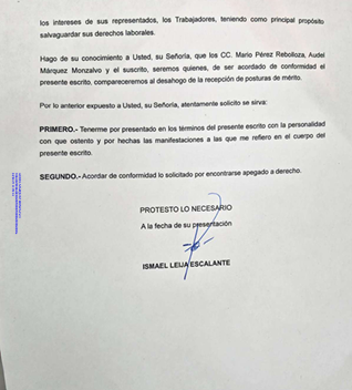 La titular del órgano jurisdiccional, la licenciada Ruth Haggi Huerta, resolvió que el promovente no acreditó con documento idóneo la personalidad con la que se ostentó como representante jurídico del sindicato, por lo que el escrito fue agregado sin mayor pronunciamiento.